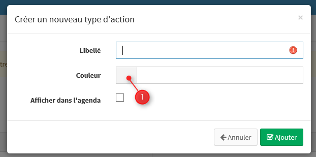 - Afficher dans l'agenda : si vous souhaitez que ce type d'action apparaisse dans l'agenda, il faudra cocher la case. Dans le cas contraire, la laisser vide.