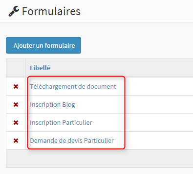 Pour accéder et paramétrer un formulaire, il vous suffit de cliquer sur celui qui vous intéresse dans la liste des formulaires