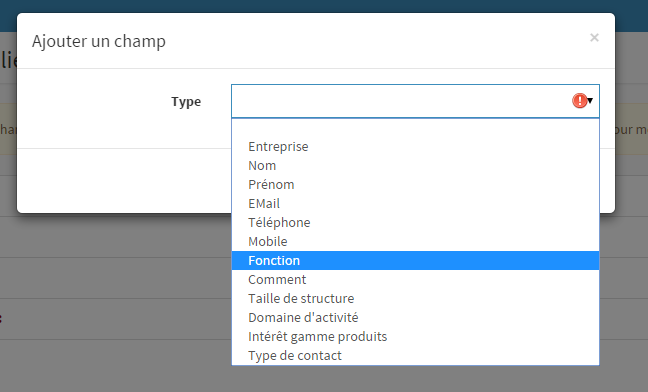 Pour ajouter un champ, il suffit de cliquer sur "Ajouter un champ" pour paramétrer le champ supplémentaire que vous souhaitez rajouter. Lorsque vous cliquez sur "Ajouter un champ", Koban vous suggère une liste déroulante des champs standards existants :