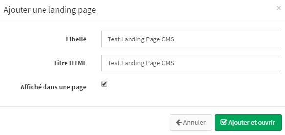 Pour créer une landing page à afficher directement dans votre CMS, cochez "Affiché dans une page" lors de la création de votre landing page. Aucun template de landing page est nécessaire.