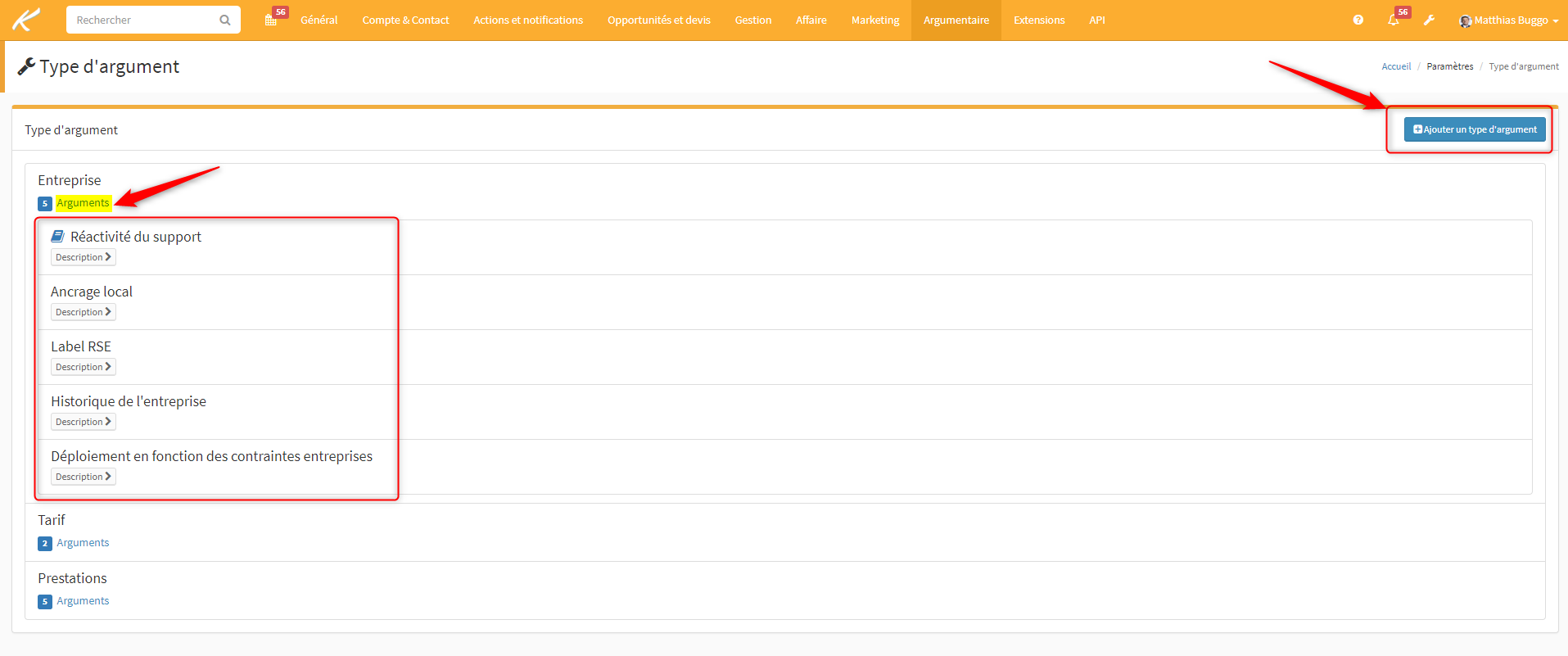 Tout d'abord, il va vous falloir paramétrer les différents types d’arguments que vous utilisez. Il s'agira de catégories qui regrouperont ensuite plusieurs arguments.