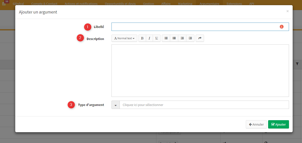 Pour ajouter un nouvel argument, il vous suffit de cliquer sur "Ajouter un argument". Vous arrivez sur l'écran de saisi de l’argument