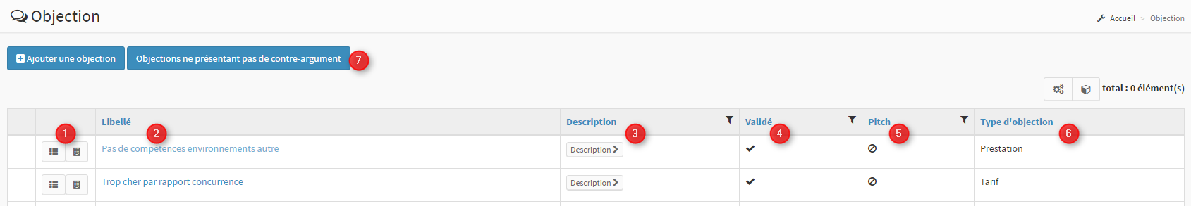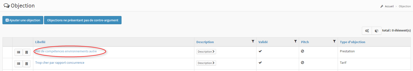 Dans le nouvel écran, vous aurez une vision des types des objections déjà paramétrées avec le nombre d'objections référencées dans chaque catégorie. Vous pourrez les visualiser en cliquant sur ''Objections''