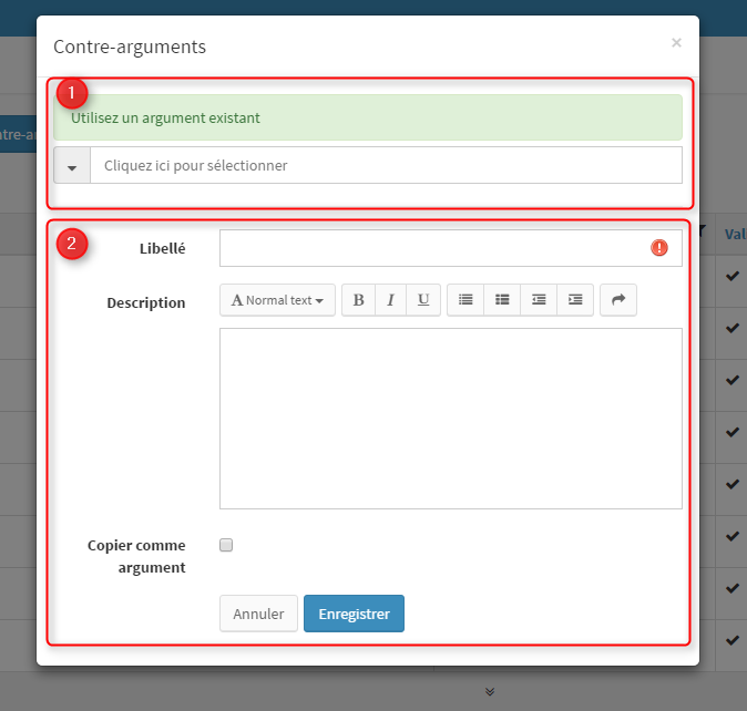 - Vous n'avez pas de contre-argument en stock ? Il vous faudra donc compléter le pavé 2 pour le renseigner. Si cela vous semble pertinent, vous pouvez même transformer ce contre-argument en argument en cliquant la case "Copier comme argument". Cliquez sur "Enregistrer" pour valider.