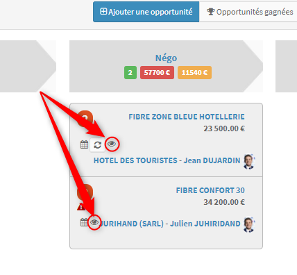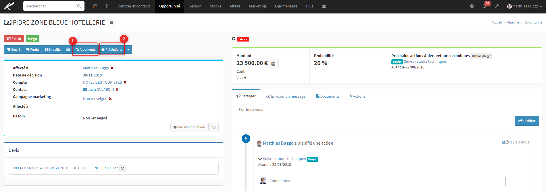 Désormais, depuis les opportunités, les commerciaux peuvent renseigner les informations (1) et générer les prédictions (2) :