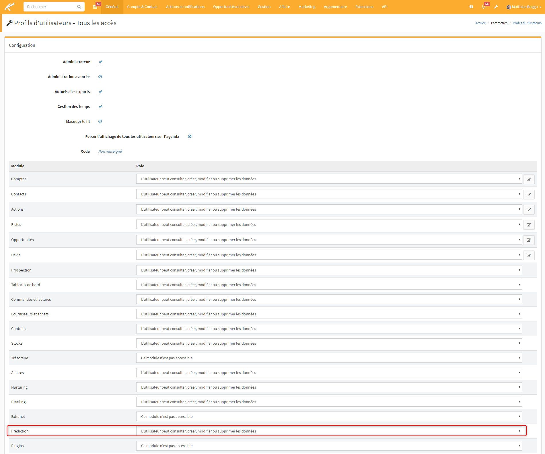 Dans l'écran de paramétrage qui apparaît, allez au niveau de "Prédiction" et sélectionnez "L'utilisateur peut consulter, créer, modifier ou supprimer les données".