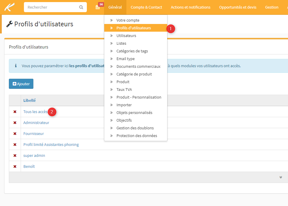 Dans les paramètres, allez dans "Général" puis "Profils d'utilisateurs" (1) puis cliquez sur les profils d'utilisateurs à paramétrer ("Tous les accès" par exemple (2))
