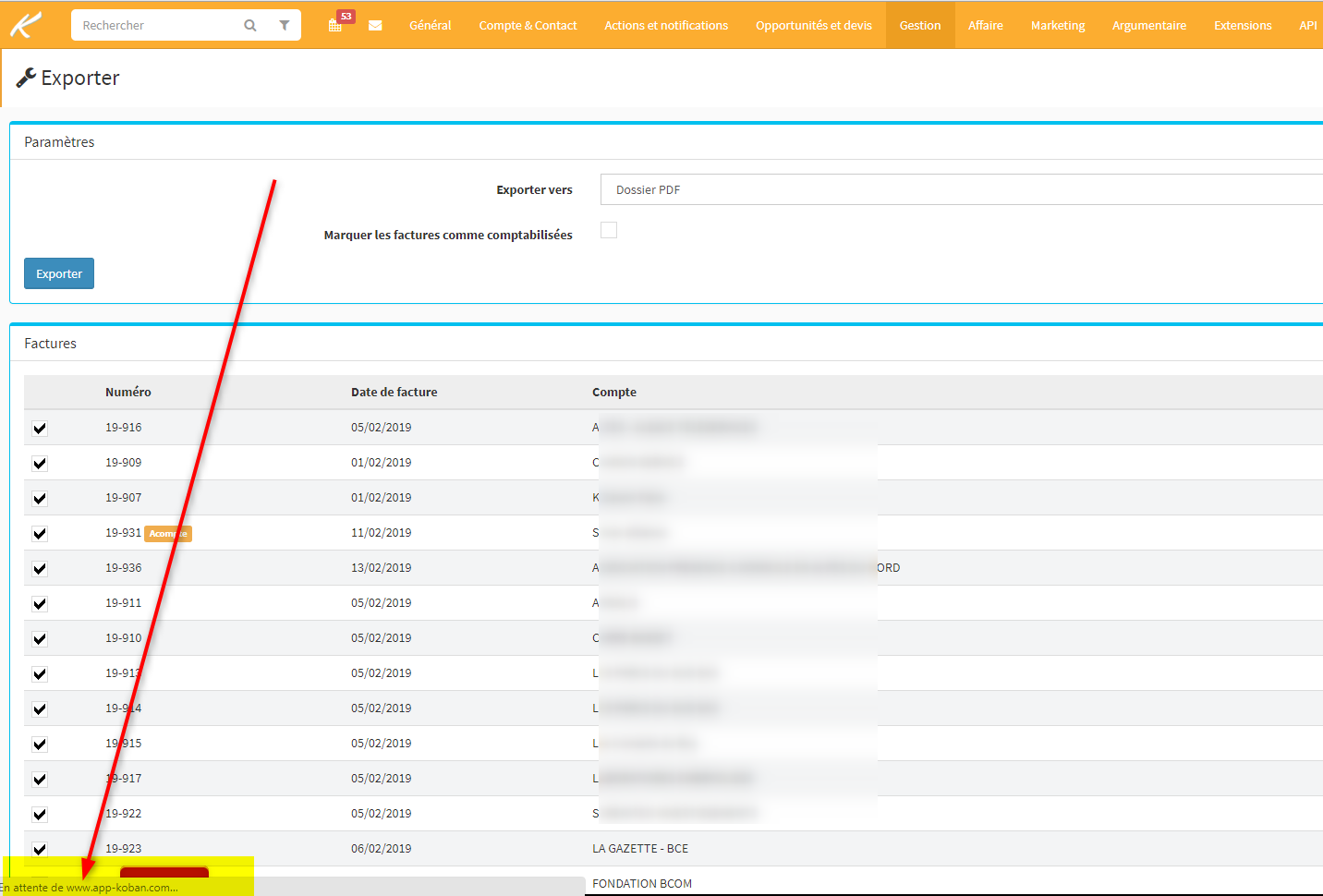 Vous voyez tout en bas de votre page web "En attente de www.app-koban.com", signe que Koban est en train de générer le dossier avec les factures PDF.