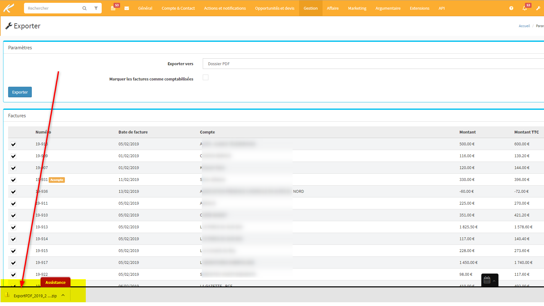 Si vous êtes administrateur, vous pouvez décider d'exporter dans un dossier l'ensemble des factures d'un mois sous formats PDF.