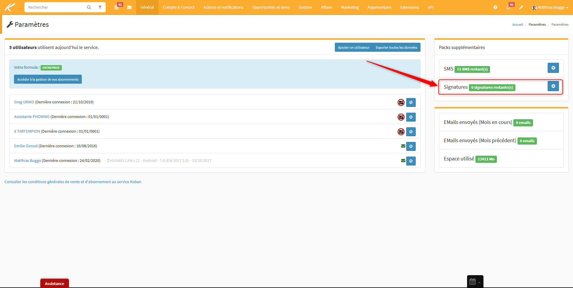 Pour que la fonctionnalité de signature électronique soit accessible, il faudra l'activer dans les paramétrages de votre Koban.