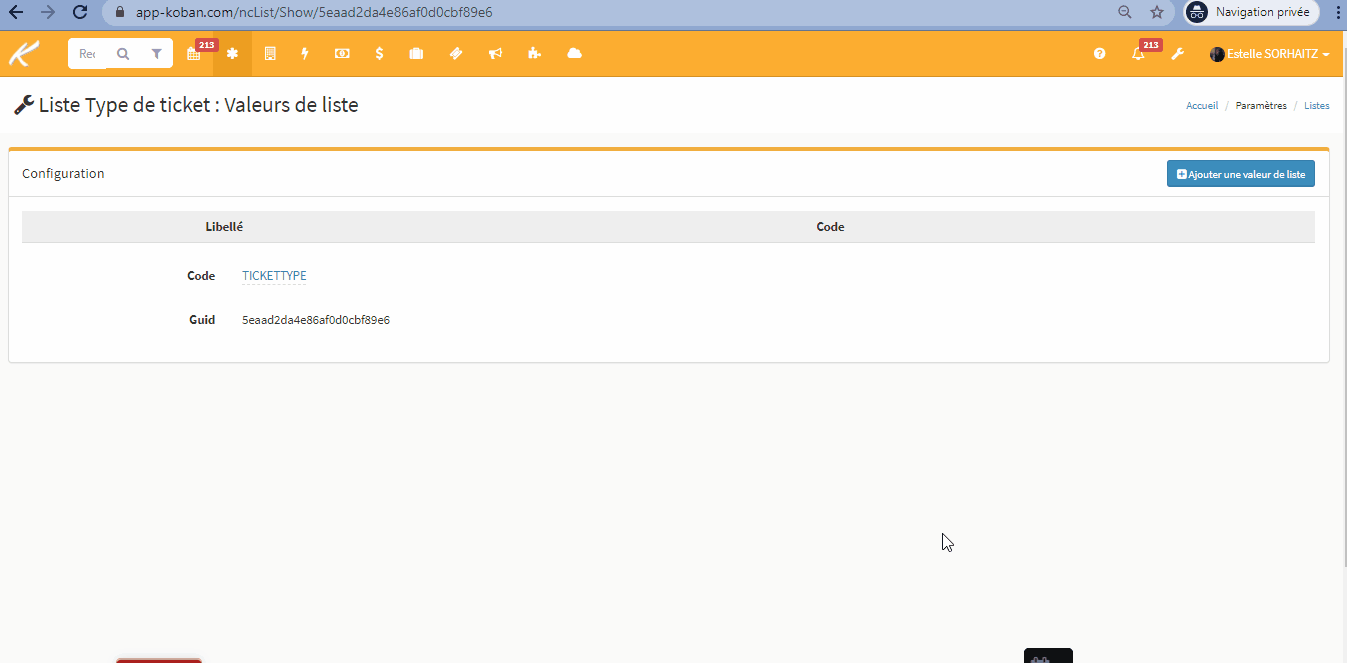 Sur cette page, descendez tout en bas et cliquez sur le nom de liste "Type de ticket".