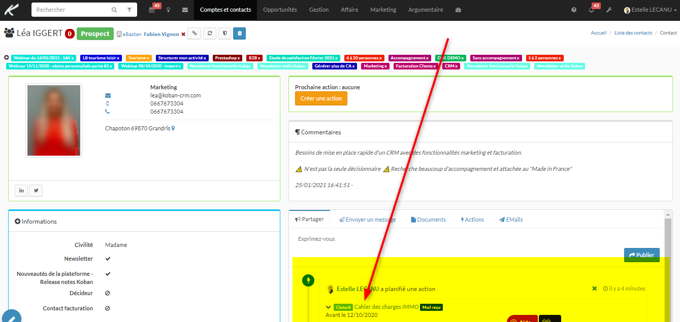 Vous pourrez dans Koban retrouver le mail reçu ET le contact créé.